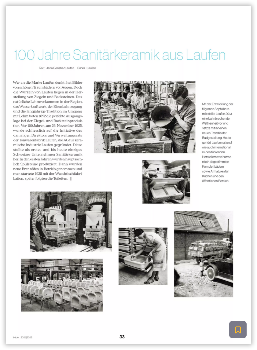 Die Wurzeln der international bekannten Marke LAUFEN liegen in der Herstellung von Tonbaustoffen. Das natürliche Lehmvorkommen in der Region, ein Wasserkraftwerk und ein Eisenbahnzugang boten 1892 die perfekte Ausgangslage für die Ziegel- und Backsteinproduktion. Vor fast 100 Jahren, am 26. November 1925, wurde die »AG für keramische Industrie Laufen» gegründet. Sie stellte als erstes und bis heute einziges Schweizer Unternehmen Sanitärkeramik her.