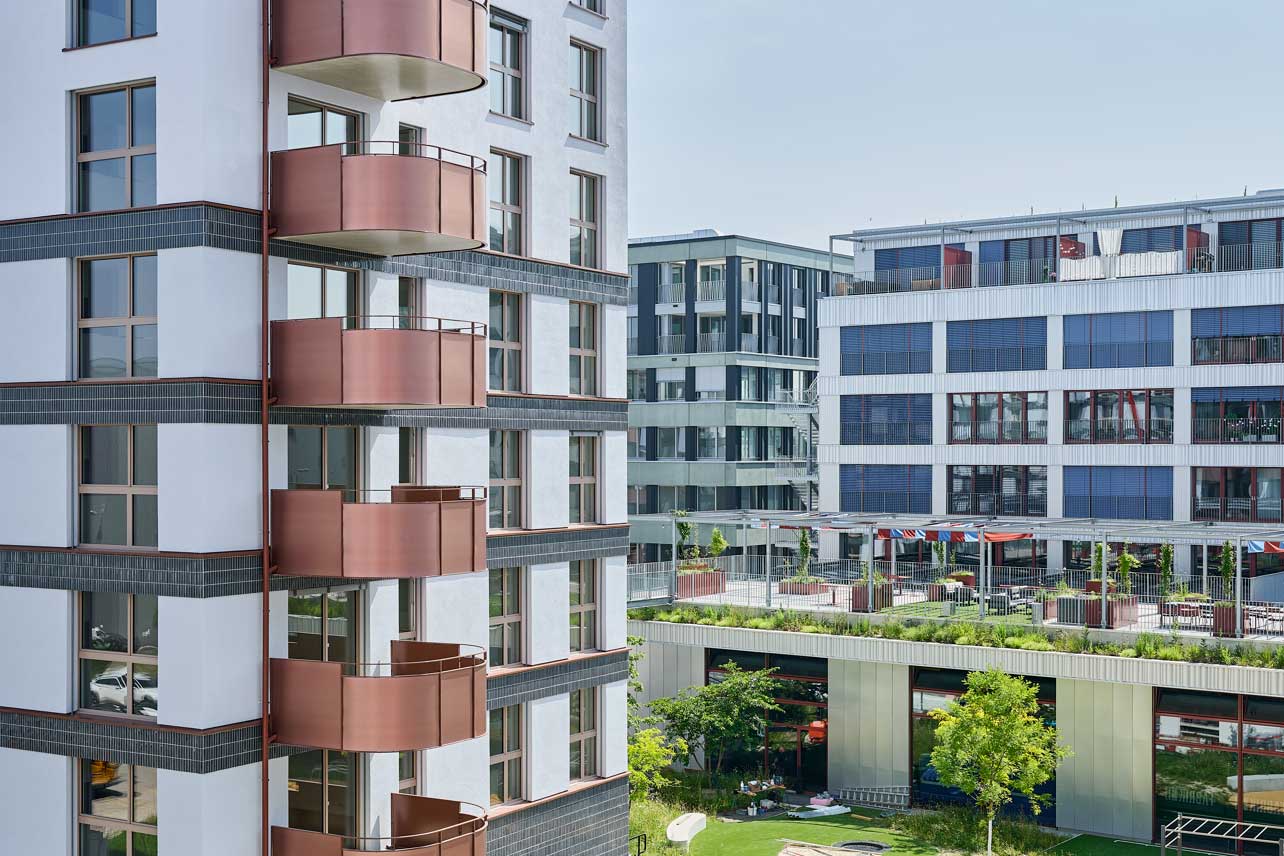 Äusserlich unterscheiden sich die drei sieben- bis neungeschossigen Neubauten deutlich, sei es durch die Farbgebung der horizontalen Geschossbänder oder die unterschiedlich verkleideten Sockelbereiche. Einheitlich ist dagegen der Wandaufbau: Bei allen drei Bauten bilden Fertigwände aus Backstein in Kombination mit Bauteilen aus Ortbeton das Tragwerk.